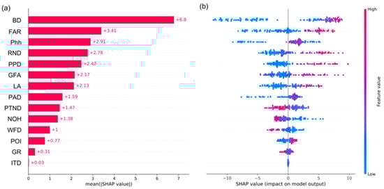 SHAP feature importance of built environment factors. (a) Importance score ranking of the model prediction characteristics; (b) Every feature’s impact on the model’s output.