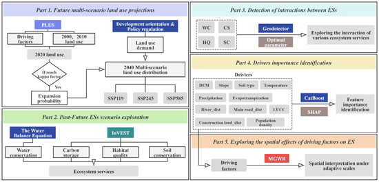We developed a comprehensive research framework to predict, interact with, and explore the driving mechanisms of ESs. This framework consists of five components (Figure 3). (1) Using the PLUS model, we selected LUCC driving factors and conducted a preliminary simulation for 2020 based on historical land use data from 2000 and 2010, ensuring simulation accuracy. Land demand for 2040 under three scenarios (SSP119, SSP245, and SSP585) was then established to inform future ES quantification. (2) The InVEST model quantified four key ESs—water conservation, carbon storage, habitat quality, and soil conservation—at various spatial and temporal scales, alongside the overall ES index, revealing historical trends and predicting future changes. (3) The OPGD model assessed interactions among the ESs, providing insights into their internal dynamics. (4) A combination of CatBoost and SHAP models evaluated the relative importance of driving factors, highlighting the impacts of climate change and human activities. (5) The MGWR model analyzed the spatial heterogeneity of ES driving factors, shedding light on the regional ES driving mechanisms. The formulas and principles of all the related models are provided in Appendix A.