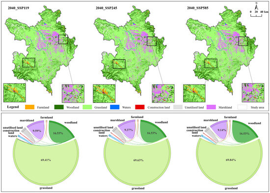 As shown in Table 1 and Figure 4, the study area experienced marked land use changes over 2000–2020: cropland increased by 24.4% (217.4 → 270.5 km2), forest land grew 8.3% (6300.6 → 6821.5 km2), water bodies expanded 58.3% (248.7 → 393.6 km2), and built-up land surged 198.5% (34.1 → 101.8 km2). Conversely, grassland decreased by 2.5% (30,546.6 → 29,772.0 km2), while wetlands declined 2.5% (4471.4 → 4360.6 km2). Compared with 2020 land use conditions, the SSP119 scenario in 2040 presents the most favorable ecological conditions, with stable forest land (an increase of 0.05%) and gradual wetland restoration (an increase of 0.33%). Additionally, the expansion of built-up areas is controlled (a slight increase of 0.29%). The SSP245 scenario assumes continued land use development following current trends, with overall land use intensity remaining high. This is primarily reflected in the unchecked expansion of built-up areas (an increase of 38.3%) and the continued reduction in wetland areas (a decrease of 1.52%). The SSP585 scenario is characterized by significant temperature increases and rapid socio-economic growth, leading to the most pronounced expansion of built-up areas (an increase of 42.6%) and the fastest rate of wetland loss (a decrease of 3.83%).