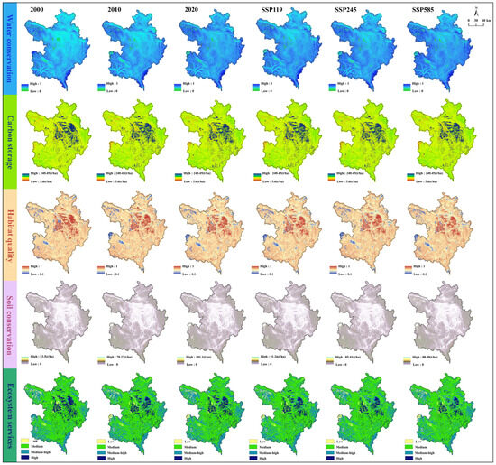 Spatial distribution of ESs from 2000 to 2020 and under three scenarios projected for 2040.