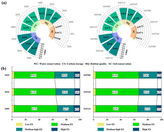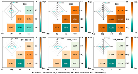 To better illustrate changes in regional ESs, standardized mean values were introduced to assess overall trends. The results (Figure 6a) show that from 2000 to 2020, regional water conservation exhibited an upward trend, while carbon storage and habitat quality showed declining trends. Soil retention remained consistently low, with minimal variation. Under the three projected scenarios for 2040, carbon storage and habitat quality perform best under SSP119, followed by SSP245, and are the lowest under SSP585; water conservation shows an opposite trend relative to scenario stress levels, being lowest in SSP119 and highest in SSP585. Soil retention remains low overall, with little change.