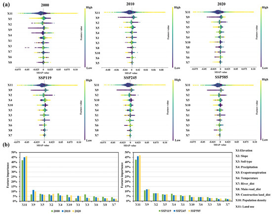 The CatBoost model was employed to explore the regression relationship between driving factors and integrated ESs in the Zoigê Plateau from 2000 to 2020, as well as under the three projected scenarios for 2040. The SHAP model was then applied to quantify the determined feature importance of 11 environmental factors. The panel depicts a swarm plot of feature composition across different years, with the X-axis representing the positive or negative influence of various driving factors on ES predictions, while the Y-axis orders features by descending importance, illustrating their relative impact on model output. The output results indicate that (Figure 8), both in the historical periods and future scenarios, land use remains the primary factor influencing comprehensive ESs, with an explanatory power ranging from 42% to 46%. It also exhibits pronounced spatial heterogeneity, as evidenced by the widest SHAP value distribution (the SHAP values ranged between −0.075 and 0.1), underscoring the necessity of land use management in plateau wetland regions. Meanwhile, distance to built-up areas, evapotranspiration, slope, and precipitation also demonstrate high feature importance, ranging between 6% and 12%. This further highlights the significant impact of human activities and climate change on comprehensive ESs.