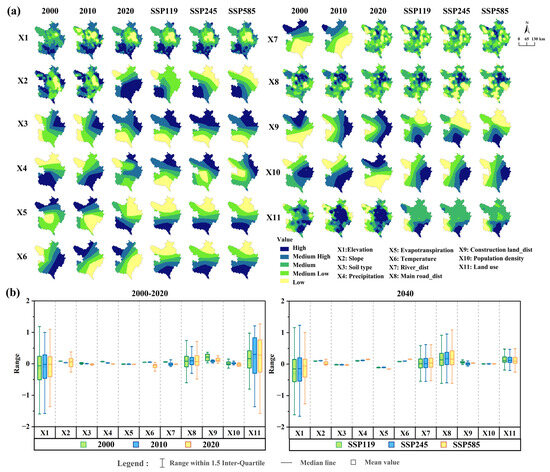In the MGWR model, beta coefficients represent localized regression parameters, with their signs (±) indicating the directional effects of driving factors on integrated ESs. This approach quantifies the spatial heterogeneity of these impacts, allowing the development of targeted management strategies, where the magnitude of the effects guides the intervention intensity. To visualize spatial heterogeneity, absolute beta values were classified into five effect gradients (high, medium-high, medium, medium-low, low) using the natural breaks classification method, corresponding to distinct intensity levels of driving forces. The results (Figure 9a) show that between 2000 and 2020, the spatial effects of climate and human activity drivers (precipitation, evapotranspiration, temperature, and population density) exhibited significant fluctuations. However, by 2040, all driver factors under three different scenarios stabilized, suggesting that the future ESs may enter a de-chaotic state, with the degree of degradation being increasingly controlled by environmental variables. Additionally, we calculated the overall condition by sampling all grid cells and using the 1.5 interquartile range, median, and mean values. The results (Figure 9b) show that from 2000 to 2020, slope, precipitation, distance to major roads, distance to built-up areas, and land use type positively affected ESs, while precipitation and temperature shifted from positive to negative effects, and elevation had a strong negative effect. In 2040, under all scenarios, slope, precipitation, temperature, distance to rivers, distance to major roads, and land use type continued to show positive effects, while elevation and evapotranspiration had negative effects. As environmental pressures increased across SSP scenarios, the positive effects of precipitation, temperature, distance to rivers, and roads strengthened, while those of distance to built-up areas and land use type weakened. Evapotranspiration increasingly exhibited a negative effect.