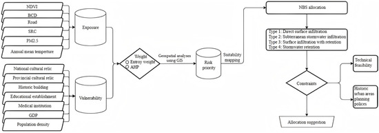 The proposed framework for prioritizing and allocating Nature-Based Solutions (NbSs) in historic urban landscapes. The framework comprises three main components: (1) exposure indicators, such as the Normalized Difference Vegetation Index (NDVI), Building Congestion Degree (BCD), Road Network Density, Surface Runoff Coefficient (SRC), Particulate Matter (PM2.5), and Annual Mean Temperature; (2) vulnerability indicators, including National and Provincial Cultural Relics, historic buildings, educational establishments, medical institutions, Gross Domestic Product (GDP), and population density; and (3) risk priority and NbS allocation, combining exposure and vulnerability metrics through an integrated weighting scheme (Entropy Weighting and Analytic Hierarchy Process). Geospatial analyses using GIS are applied in all stages, from data processing to suitability mapping.