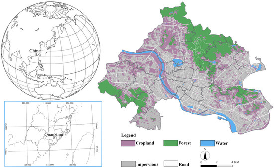 Geographic location and land use distribution of the study area, Quanzhou, China. The map illustrates the spatial distribution of key land use types, including cropland, forest, water bodies, impervious surfaces, and major roads.