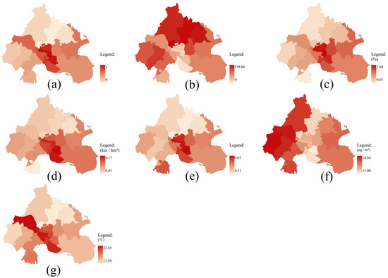 Spatial distribution of urban flooding exposure. The figure illustrates (a) urban flooding exposure, along with the following key contributing factors: (b) Normalized Difference Vegetation Index (NDVI), (c) Building Congestion Degree (BCD), (d) Road Network Density (RND), (e) Surface Runoff Coefficient (SRC), (f) Particulate Matter (PM2.5), and (g) Annual Mean Temperature.