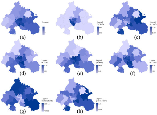 Spatial distribution of urban flooding vulnerability. The figure presents (a) urban flooding vulnerability and its contributing indicators: (b) national cultural relics, (c) provincial cultural relics, (d) historic buildings, (e) educational establishments, (f) medical institutions, (g) Gross Domestic Product (GDP), and (h) population density.