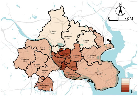 This assessment ascribes relatively large weights to educational establishments and medical institutions, at 10.6% and 8.4%, respectively (Table 3). These figures reflect the roles of such infrastructure in fostering urban resilience. These institutions are vital not only for their primary services but also as sanctuaries and resource hubs in the event of floods [60]. The impairment of these facilities during floods can exert extensive repercussions on community welfare, a notion supported by Zhang et al. [61]. Moreover, the weights attributed to GDP and population density are 4.3% and 5.7%, respectively. The methodology adopted in this study resonates with the approach of Pacetti et al. [20], who utilized a multi-criteria decision analysis framework, integrating indicators like population density, GDP, and sensitive infrastructures to construct vulnerability maps.
