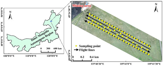 The study area is located in the HulunBuir grassland in the Inner Mongolia Autonomous Region, China (49°24′22″–49°25′37″ N, 119°38′27″–119°40′32″ E), southeast of the Dongming Mine in HulunBuir (Figure 1). The region has a continental subarctic climate with distinct seasons. The climate is dry, with sparse precipitation, abundant sunshine, and large diurnal temperature variations. The area is often affected by Siberian cold air masses, resulting in long, cold winters. The lowest recorded temperature is −42.6 °C, and the highest is 38.8 °C, with an annual average temperature of −0.6 °C. The average annual precipitation is 372 mm, and the average annual evaporation is 1247 mm. The predominant wind direction is northwest, the instantaneous maximum wind speed is 20 m/s, and the annual average wind speed is greater than 3 m/s.
