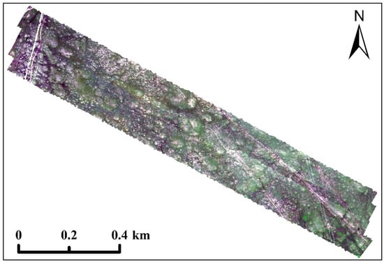 Subsequently, a georeferenced mosaicking method was employed to stitch the individual flight strips together, generating an orthophoto covering the entire study area. Finally, a median filter was applied to smooth and denoise the image. The processed hyperspectral data are shown in Figure 2. Georeferenced mosaicking and median filter were performed using the ENVI 5.3 software. Extract the spectral curve of the corresponding pixel from the hyperspectral data based on the coordinates measured in the field.