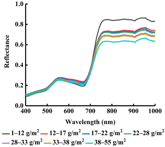 All of the samples were divided into seven levels based on the dust retention from low to high, and the average reflectance of each level was calculated (Figure 3). As can be seen from Figure 3, the spectral curves for the different dust retention levels have similar shapes, and all exhibit typical vegetation spectral characteristics. In the visible wavelength of 400–700 nm, as the dust retention increases, the spectral reflectance initially increases and then decreases. Specifically, when the dust retention increases from the first level (1–12 g/m2) to the second level (12–17 g/m2), the spectral reflectance increases. However, as the dust retention continues to increase, the reflectance gradually decreases. In the near-infrared wavelength of 700–1000 nm, the spectral reflectance decreases as the dust retention increases.