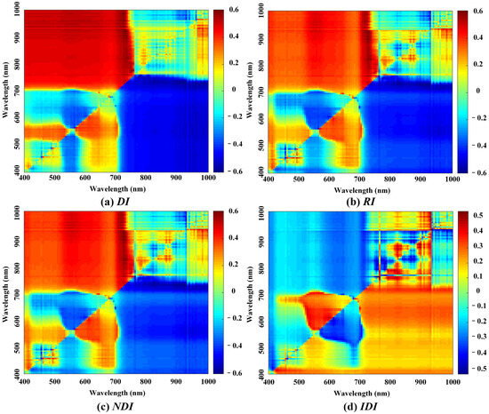 Figure 5 displays the correlation matrix between the four spectral indices and canopy dust retention. The correlation coefficients in the matrix are color-coded, transitioning from cool tones (blue) to warm tones (red). Red represents a significant positive correlation, blue represents a significant negative correlation, and yellow and green indicate that the correlation coefficient is close to 0, meaning there is no significant correlation. The correlation matrices of the four spectral indices are divided by the diagonal, with the correlation coefficients in the upper and lower parts exhibiting opposite relationships. Specifically, the correlation matrices of the DI, RI, and NDI exhibit similar distribution patterns. That is, significant positive correlations occur in the four intervals of (400–703 nm, 709–1000 nm), (400–515 nm, 526–563 nm), (526–563 nm, 568–698 nm), and (901–929 nm, 969–1000 nm); while significant negative correlations occur in the ranges of (526–563 nm, 400–515 nm), (568–698 nm, 526–563 nm), (709–1000 nm, 400–703 nm), and (969–1000 nm, 901–929 nm). In contrast, the distribution pattern of the correlation matrix of the IDI is opposite compared to those of the other three indices. This is because the IDI is derived by calculating the reciprocal of the spectral data, and thus, its correlation trends are inversely related to those of the DI, RI, and NDI. Further analysis reveals that when using the same wavelength bands for the calculation, the absolute correlation coefficient of the IDI is smaller than those of the DI, RI, and NDI. This finding indicates that the DI, RI, and NDI are more effective in extracting spectral information related to plant canopy dust retention, thereby enhancing their correlation and characterization capabilities for canopy dust retention inversion.
