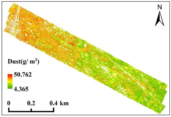 The hyperspectral image was classified into two categories, plant and bare soil, using a supervised classification method. The RF model was applied to the plant area, and the spatial distribution map of canopy dust retention produced by the ArcGIS 10.5 software is shown in Figure 6. Each pixel represents the canopy dust retention content, and it is color-coded, with red indicating high dust retention content and green indicating low dust retention content. As can be seen from Figure 6, the dust retention range obtained from the hyperspectral image inversion is 4.365–50.762 g/m2, and the high-value areas are primarily concentrated within 900 m of the mining area. As the distance from the mining area increases, the canopy dust retention gradually decreases. In addition, the inversion results tend to be overestimated in the low dust retention range and slightly underestimated in the high dust retention range. This phenomenon is reflected in the fact that the minimum inversion value is higher than the measured minimum value, and the maximum value is lower than the measured maximum value, indicating that there is some error in the model’s prediction of extreme values.