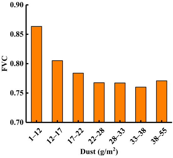 To further understand the influence of dust retention on the fractional vegetation cover (FVC), Figure 7 shows the average FVC values for the different dust retention levels. As can be seen from Figure 7, as dust retention increases, the average vegetation cover tends to decrease gradually; this is consistent with the conclusion found by Li et al. in their study of the East Junggar basin in Xinjiang, China [45]. This phenomenon can be explained by the influence of dust retention on the plant’s physiological functions. Zia-Khan et al. [57] found that dust retention would increase leaf surface temperature and decrease stomatal conductance, which would affect photosynthesis. The research results of Chaston et al. [58] and Popek et al. [59] indicate that factors such as shading of plant leaves, blockage of stomata, and high leaf temperature caused by dust retention can affect plant photosynthesis. Dust retention not only affects the photosynthesis of plants but also inhibits their respiration and transpiration [60,61]. Hou et al. [62] found that dust retention would reduce the net photosynthetic efficiency, stomatal conductance, and transpiration rate of leaves, ultimately leading to a decrease in biomass. Zhang et al. [63] found that dust retention can reduce the photosynthetic rate, stomatal conductance, and transpiration rate of plant leaves while leading to an increase in intercellular carbon dioxide concentration and leaf temperature. Prolonged stomatal blockage not only reduces the plant’s ability to absorb water and nutrients but also potentially limits plant growth, accelerating the aging of plants [60]. Furthermore, harmful substances (such as heavy metals) in the dust may be absorbed by plants through their leaves, affecting their growth, development, and resistance capabilities [64]. These not only slow down plant growth but also weaken the plant’s ability to adapt to environmental changes, leading to decreases in vegetation cover and ecological recovery. Therefore, there is a negative correlation between dust retention and vegetation cover, indicating that dust retention has a significant inhibitory effect on plant growth.