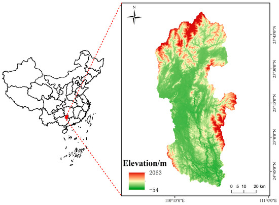 The Lijiang River Basin is located in the city of Guilin, Guangxi Zhuang Autonomous Region, China, and ranges from 111°07′ E to 111°47′ E and 24°38′ N to 25°53′ N. The Lijiang River Basin is 164 km long and has a total drainage area of 5789.83 km2. The terrain is high in the north, low in the south, high on the east and west sides, and low in the middle (Figure 1). The average annual precipitation in the basin is 1342.5 mm. The average annual temperature is 19 °C. Excellent hydrothermal conditions provide high vegetation coverage and diverse vegetation types, of which forest land accounts for 70%. Thus, the Lijiang River Basin is an important ecological region in the Guangxi Zhuang Autonomous Region. In recent years, as China has attached more importance to the construction of ecological civilization, the protection and development of this basin have been more scientifically and systematically managed, not only ensuring the sustainability of the natural landscape but also promoting the sustainable development of the local economy. However, with the acceleration of urbanization, construction land has expanded in recent years, and the areas of cultivated land, forest, and grasslands have changed to varying degrees, impacting regional carbon storage [9,22]. Therefore, studying the changes in different land use types and their carbon reserves in this area has important reference value for ecological protection and achieving the national “double carbon” goal.