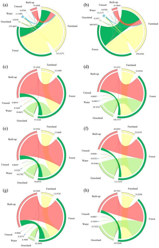 Chord diagram of land use changes in the Lijiang River Basin (unit: km2). Notes: (a) 2000~2010, (b) 2010~2020, (c) SSP126-2030, (d) SSP126-2060, (e) SSP245-2030, (f) SSP245-2060, (g) SSP585-2030, and (h) SSP585-2060. The values in the figure represent the amount of change in different land use types.