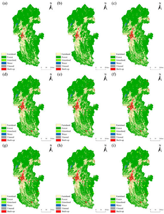 Spatial and temporal evolution characteristics of land use in the Lijiang River Basin. Notes: (a) 2000, (b) 2010, (c) 2020, (d) SSP126-2030, (e) SSP245-2030, (f) SSP585-2030, (g) SSP126-2060, (h) SSP245-2060, and (i) SSP585-2060.