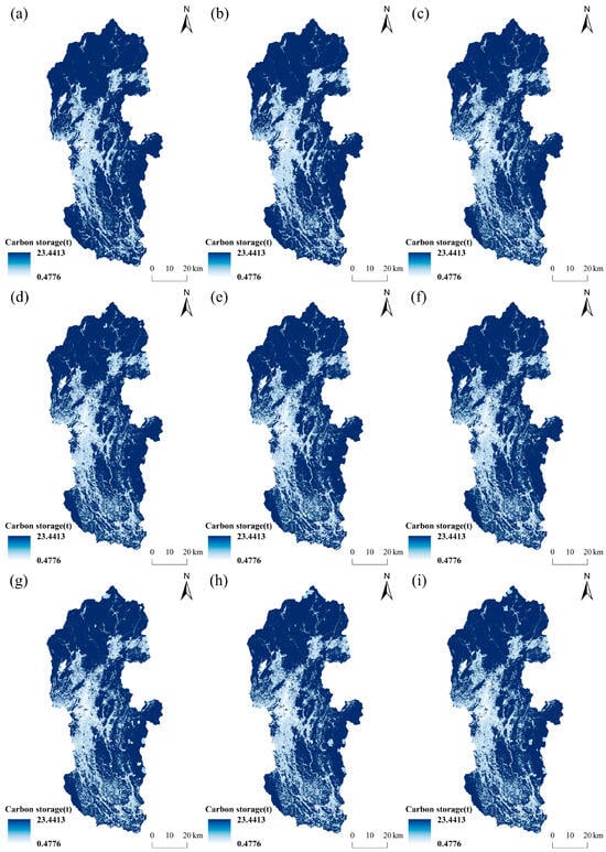 Future-scenario carbon storage distribution in the Lijiang River Basin. Notes: (a) 2000, (b) 2010, (c) 2020, (d) SSP126-2030, (e) SSP245-2030, (f) SSP585-2030, (g) SSP126-2060, (h) SSP245-2060, (i) SSP585-2060.