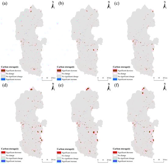 Figure 5 shows the spatial change distribution characteristics of future carbon stocks in different scenarios compared with 2020. Figure 5 shows that by 2030, the regions showing significant reductions in carbon storage under the SSP126, SSP245, and SSP585 scenarios will mainly be concentrated in the northeast, midwest, and southeast. These reduced carbon storage areas will mainly be used for construction land. At the same time, insignificant changes occupy the majority of the study area. However, the significant increase in carbon storage will be scattered and concentrated in the central and western regions. The regions with significant reductions in carbon stocks in 2060 will continue to expand in SSP126 and SSP245, with declines particularly pronounced in the southeast and northern regions. In the SSP585 scenario, the area of significant carbon storage reduction is larger, indicating that the high-emission model will lead to more serious damage to the basin ecosystem. In general, the changes in carbon storage in most regions of the Lijiang River Basin are not significant under these future climate scenarios.