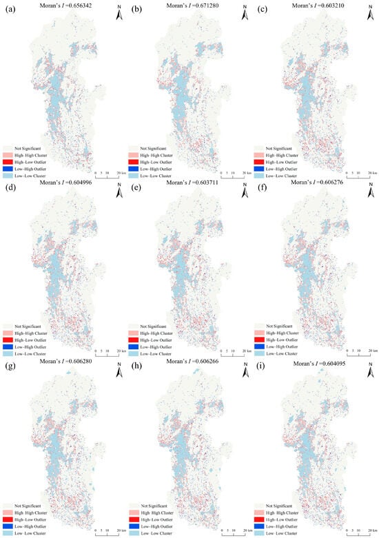 LISA clustering of carbon storage in Lijiang River Basin from 2000 to 2060. Notes: (a) 2000, (b) 2010, (c) 2020, (d) SSP126-2030, (e) SSP245-2030, (f) SSP585-2030, (g) SSP126-2060, (h) SSP245-2060, and (i) SSP585-2060.