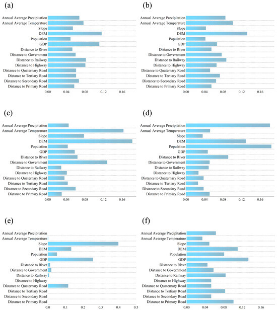 Degree of contributions of different driving factors to different land use types. Notes: (a) farmland, (b) forest, (c) grassland, (d) water, (e) unused, and (f) built-up.