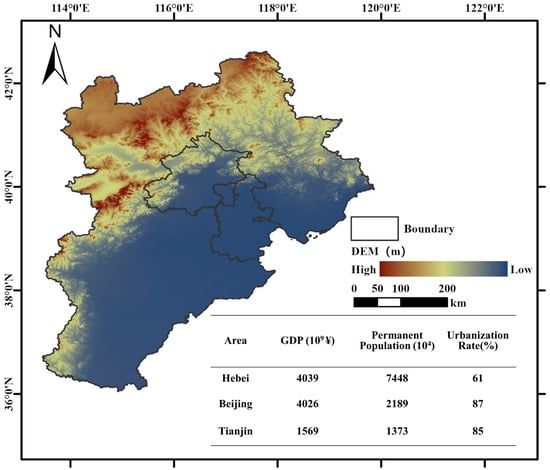 Overview of the Beijing–Tianjin–Hebei urban agglomeration. Note: DEM represents elevation values in terms of altitude.