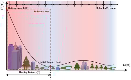 As shown in Figure 2, as the distance r increases, T in the buffer zone decreases, but the decreasing rate gradually approaches 0. The initial turning point occurs when the first-order derivative of T (r) is 0. Comparing this with the definition of the turning point of the maximum cold zone distance in the study of the greenfield cooling effect conducted by Yu [40], the initial turning point here indicates that the heating effect of the built-up area decreases for the first time as the distance between the buffer zone and the built-up area increases. Beyond the distance, the built-up area will no longer have a significant heating effect. The distance from the boundary of the built-up area to the initial turning point is defined as L, representing the range of significant UHI effects in the built-up area.