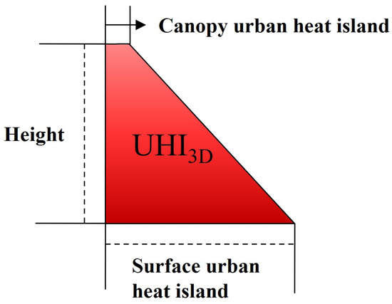 Previous investigations typically established correlations between UHI intensity and energy demand indicators (e.g., electricity consumption) to indirectly estimate UHI-induced energy impacts [42]. As noted, the UHI definition in this study integrates both impact extent and intensity, rather than relying on the conventional urban–suburban temperature difference. Based on this, we propose a hypothesis: if the vertical extent of UHI influence can be determined under our defined framework, it would be possible to estimate the energy associated with air temperature variations within the affected volume. The most critical aspect of this hypothesis is defining the vertical range of UHI influence. Shen et al. found that, during summer daytime, China’s surface UHI effect is approximately ten times stronger than the canopy UHI effect at a height of 2 m [43]. Additionally, Li et al. demonstrated that the near-surface air temperature lapse rate in China follows an overall linear trend below 100 m [44]. Building upon these findings, we attempted to quantify the UHI3D (Figure 3), as shown in Equation (9).