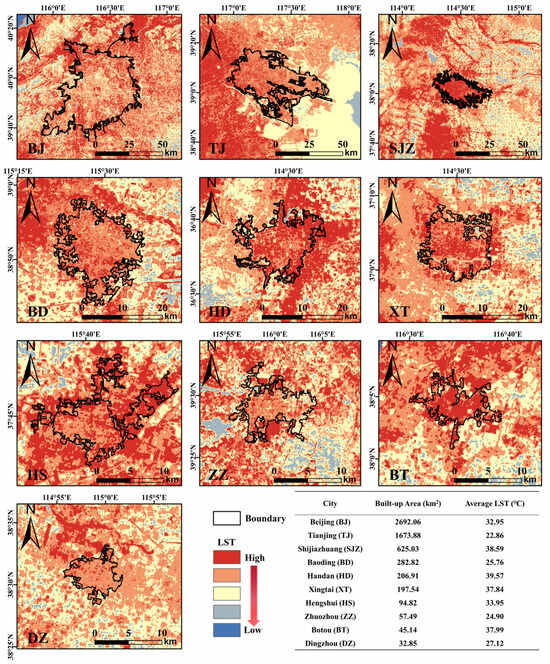 A total of 18 urban areas were selected in the BTH urban agglomeration, of which 10 urban areas exhibited a significant heat island effect (Figure 4). As shown in Figure 4, the average LST of the built-up area of Beijing (BJ), which has the largest built-up area (2692.06 km2 with 32.95 °C), is 5.04 °C lower than the average LST of the built-up area of Botou (BT), which has the smallest built-up area (45. 14 km2 with 37. 99 °C). As mentioned above, there are significant differences between cities due to variations in geographic location, climatic conditions, and construction, making a direct comparative analysis of the heat island effect across cities less credible.