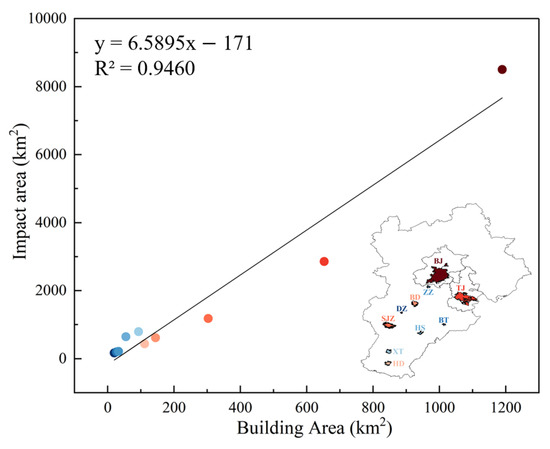 The building areas of 10 cities (Figure 5) were obtained using the CNBH-10m data. The largest building area is BJ (1189. 66 km2), followed by TJ (652.91 km2). The smallest building area is Dingzhou (DZ) (19. 98 km2). Firstly, the HEI-building area driving law was determined from a 2D perspective to verify the feasibility of the driving law between building volume and HEI from a 3D perspective. In this study, the relationship between the heat island impact area and building area was established (Figure 6), and the curve fitting results showed that the building area has a significant linear relationship with the heat island impact area (R2 = 0.9460). The heat island impact area grows linearly with the expansion of the building area.