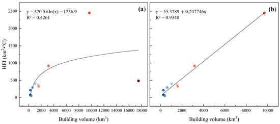 Relationship between building volume and HEI: (a) 10 urban built-up areas; and (b) 9 urban built-up areas except Beijing.