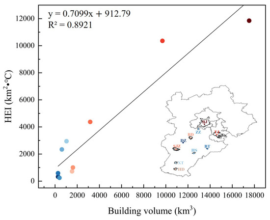 It is noticeable that the data points from BJ exhibit a significant offset from the trend line, similarly affecting the fitting results. To eliminate the influence of megacity specificity, the relationship between the building volume and the HEI was established after removing BJ (Figure 8b). The results of curve fitting exhibit a significant linear relationship (R2 = 0.9340), where the HEI linearly increases with the increase in building volume.