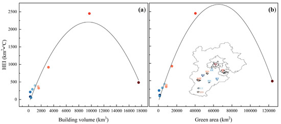 Impact of city specificity on HEI: (a) optimal mathematical statistical relationship for building volume–HEI; and (b) relationship between green area and HEI.