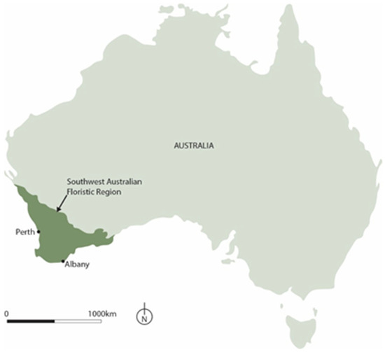 - Hopper, S.D.; Gioia, P. The Southwest Australian Floristic Region: Evolution and conservation of a global hot spot of biodiversity. Annu. Rev. Ecol. Evol. Syst. 2004, 35, 623–650. [Google Scholar] [CrossRef]