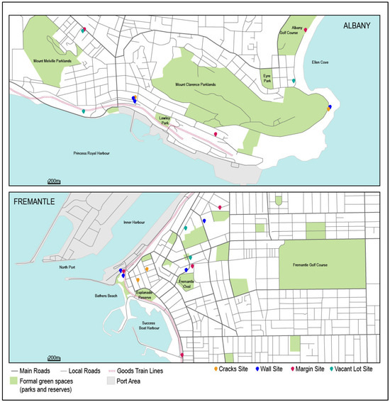 Fieldwork was carried out in two cities within the SWAFR, Albany and Fremantle (Figure 1, Table 1). Both cities have a similar colonial history and built environment, and their port activities were instrumental in trade (e.g., the introduction of plant species) from their inception in the early to mid-nineteenth century onward. The urban development of both cities has involved the large-scale removal of native vegetation and topographical change. Their urban landscapes are based on a grid system layout of European origin. They have compact urban precincts (around 2 km2) located close to their port zones, which extend into suburbia with a mixture of public parks, private gardens, and street plantings that have traditionally followed the European Gardenesque style, dominated by exotic plant species [21]. The materiality of the built environment was initially dominated by locally sourced rocks (e.g., granite and limestone), which are still present in many buildings, walls, and other structures in both cities. Urban biotopes are a mosaic of the first, third, and fourth natures throughout their urban landscapes (e.g., native remnant bushland areas, lawns, flower beds, urban forests, verges, walls, and vacant lots), while the third nature, found on agricultural and pastoral plots of land, has largely been lost and built over as the urban footprint has expanded outward.