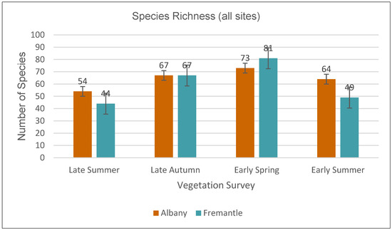 The total number of species in each city was lowest in late summer and peaked in early spring (Figure 3). The numbers of species in the two cities in late autumn and early spring were very similar, while Albany had 10–15 more species present during the two summer surveys.