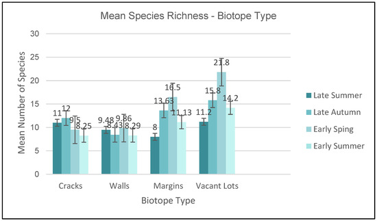Observations during site visits made it clear that there were differences between species and maintenance practices (e.g., mowing) in different biotope types. Vacant lot and margin sites generally had larger soil surface areas for plants to grow on, with less frequent or invasive maintenance regimes than crack and wall sites (e.g., mowed rather than sprayed with herbicides), which resulted in more species, more vegetation, and a wider variety of phenological stages present at each survey. A more detailed discussion of the analysis of biotope types and specific sites follows.