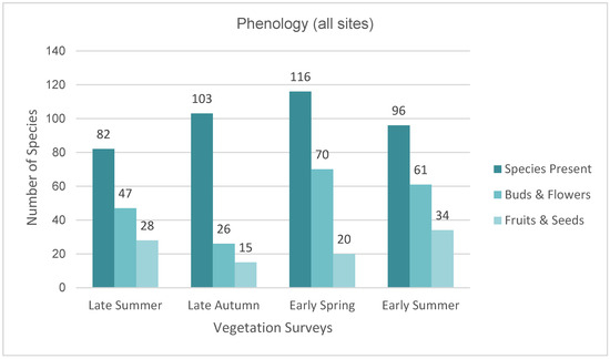 The combined phenological data for all sites exhibited a general trend toward a peak of flowering plants in early spring (70 species) and a low- in late autumn (26 species) (Figure 5). These results are consistent with the growth habit of most annual species in Southwest Australia, which establish over winter before flowering through spring and into summer. The first surveys in late summer had the least number of species (82), but over half of the species in bud and/or flower (47). In contrast, the late autumn survey had 103 species, with 26 in bud and/or flower. The number of species fruiting and/or with seeds peaked in early summer (34 species), which is consistent with seeds following the peak flowering time of spring.