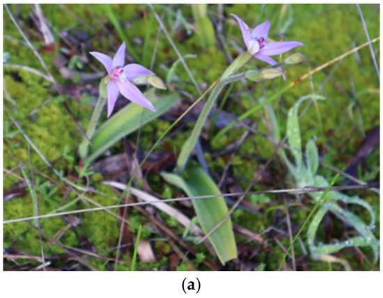 The species in our study were predominantly introduced species that have been able to take advantage of opportunities to establish in urban situations that most native species have not. Most introduced species were annual, while most Australian species were perennial or woody plants. Most of the native species in our study were also known to have a widespread range, and are used in revegetation projects or sold commercially as ornamentals, indicating their success in cultivation and tendency to adapt and thrive in more urban situations than other native species. For example, Melaleuca lanceolata and Agonis flexuosa have naturalised outside their natural range and into biotope types they are not normally associated with in Western Australia, due to their widespread use as ornamentals and for rehabilitation and amenities [48]. Ficinia nodosa has a widespread coastal range within and outside of the Australian continent. Adenanthos sericeus had the smallest natural range of the native species in our study, limited to the coastal sandhills and outcrops between Albany and Esperance [48]. Still, it has been successfully cultivated and sold as a garden ornamental throughout Australia. Caladenia latifolia (Figure 6) is native to the southern parts of Australia. This finding supports the existing literature that most native Southwest Australian species struggle to adapt to the ongoing anthropogenic disturbances of urban landscapes [14]. However, some can adapt through means such as native seedbanks and cultural influences (e.g., maintenance activities that eliminate competition).