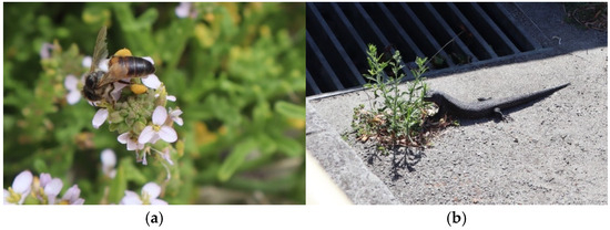 Insects, spiders, birds, reptiles, and mammals were observed in all biotope types in our study. Many insect pollinators (i.e., ants, aphids, bees, butterflies, caterpillars, cicadas, flies, hoverflies, ladybirds) and birds including Australian ravens (Corvus coronoides), Australian magpies (Gymnorhina tibicen), magpie-larks (Grallina cyanoleuca), silver gulls (Chroicocephalus novaehollandiae), singing honeyeaters (Gavicalis virescens), and willie wagtails (Rhipidura leucophrys) were seen foraging at the survey sites and their surrounds. The European honeybee (Apis mellifera) (Figure 8), naturalised in Australia, was especially common at margin and vacant lot sites. In Albany, a native King’s skink lizard (Egernia kingii), fed on spontaneous vegetation growing between cracks close to two study sites. In Fremantle, rats (Rattus) foraged among fruiting grapevines at a wall site. Birds were the most noticeable fauna during site visits, especially at vacant lots. Their ease of movement within and through various urban biotopes and our study sites demonstrates that different urban biotopes, and natures, contribute to a diverse urban nature and that nectar and habitat resources should be considered further in regard to spontaneous vegetation in Southwest Australian cities.