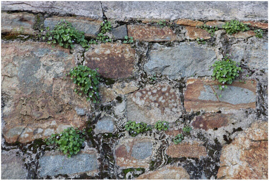 The number of species and phenological states of wall sites were similar to the crack biotope, except for one site in Fremantle, with 17–29 species in each survey. This site demonstrated the potential for mural ecologies in established wall biotopes. In The Ecology of Urban Habitats, urban ecologist Oliver Gilbert [49] discusses the increased diversity of established mural vegetation of walls over 100 years old. He explains that they are more likely to be made of materials such as natural rock, bricks, and mortar, and with the element of time, cracks and crevices develop in the mortar, resulting in soil and nutrient build-up, an increase in vegetation coverage, and seed dispersal, which creates a diverse mural ecology. The wall site in Fremantle (Figure 7) is part of an aeolianite limestone headland, Arthur Head, which was quarried, excavated, and built upon (and some parts demolished) during the nineteenth century by European settlers, changing the topography dramatically [50]. The area then went through a period of abandonment and, more recently, has undergone conservation work on the remaining buildings, pedestrian and vehicular access stairs, paths, and roads, along with stabilisation of the quarried rock faces.
