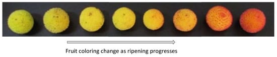 - Guerreiro, A.C.; Gago, C.M.L.; Miguel, M.G.C.; Antunes, M.D.C. The Effect of Temperature and Film Covers on the Storage Ability of Arbutus unedo L. Fresh Fruit. Sci. Hortic. 2013, 159, 96–102. [Google Scholar] [CrossRef]