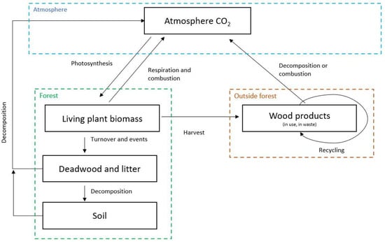 Figure 1. Simplified example showing the movement of carbon in a working forest from the atmosphere into four terrestrial carbon pools adapted from [].