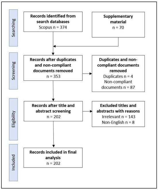 The search of Scopus yielded 374 publications, and 70 publications were identified externally. The screening and eligibility phases consisted of removing duplicates and non-English documents, then checking titles and abstracts for qualitative information on forest carbon markets and methods. Only publications that presented information on forest carbon markets or forest carbon offset methods were fully analysed. Of the total search units, 242 were excluded in the screening and eligibility phases, removing duplicates (n = 4), non-compliant publications (n = 87), abstracts of irrelevance (n = 143), and not in English (n = 8). In total, 202 publications were included in the review. Figure 2, which was adapted from [], depicts this process.