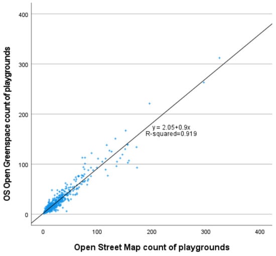 The validation of the playground data was undertaken in England by comparing the OSM derived world data against alternative data through the Ordnance Survey (OS—the country’s National Mapping Agency) Open Greenspace (https://www.ordnancesurvey.co.uk/products/os-open-greenspace (accessed 3 September 2024)), containing the location of playgrounds (termed playspaces within their data). The count of playgrounds from both datasets were compared at the settlement level using linear regression within SPSS.