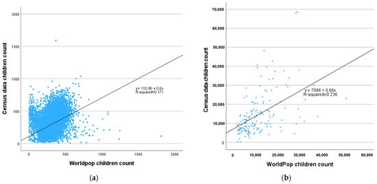 The validation of the WorldPop children’s geographies was undertaken by comparing aggregated WorldPop counts with official census counts for both England (lower layer super output areas, LSOAs) and Guangzhou, China (street-level data). An LSOA on average has a population of approximately 1500 people, whilst the average for street-level data in Guangzhou is much larger at just under 90,000 people. Despite these differences, street-level data in China are the smallest level of data commonly publicly available. Age data were downloaded for England LSOAs from Nomis (table TS007A: Age by five-year age bands) (https://www.nomisweb.co.uk (accessed 2 September 2024)). Street-level age data for Guangzhou were obtained from Guangzhou’s Bureau of Statistics []. The underlying data for England and Guangzhou can be found in Supplementary Tables S1–S3. Linear regression within SPSS was used to compare aggregated outputs for both case studies.