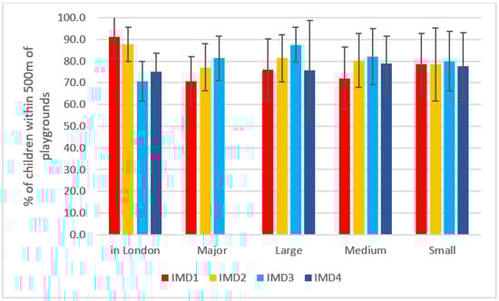 The percentage of children (under 16) within 500 m of playgrounds by level of deprivation and settlement category (with standard deviation bars).