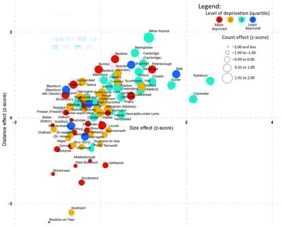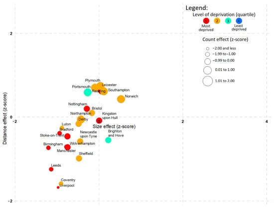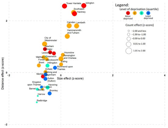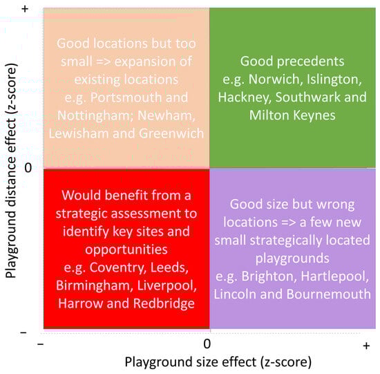Correlation outputs between each of the three playground provision domains (count, size and distance) and the level of deprivation (as a continuous measure rather than quartile) for each settlement class confirmed the negative associations between provision and deprivation in London (see Table A5 in the Appendix A). Relationships generally were weak, with only moderate significant relationships identified between the count effect and deprivation for major and medium settlements; between the size effect and deprivation for major settlements and London (London being a negative relation); and between the distance and deprivation for London (negative relation). This highlights that the relationships with deprivation were particularly weak for the distance domain.