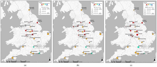 Maps of children’s playground provision: (a) count; (b) size; and (c) distance, for major settlements in England.
