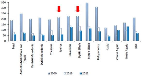 Table 2 shows a general reduction in arable agricultural land from 2015 to 2022. The RIP’s rate shows no change in essence (−0.70%), but the RDE has a significant decline of 16%. This decline is much less than that of Peloponnisos and Ionioi Nisoi but higher than nationwide.